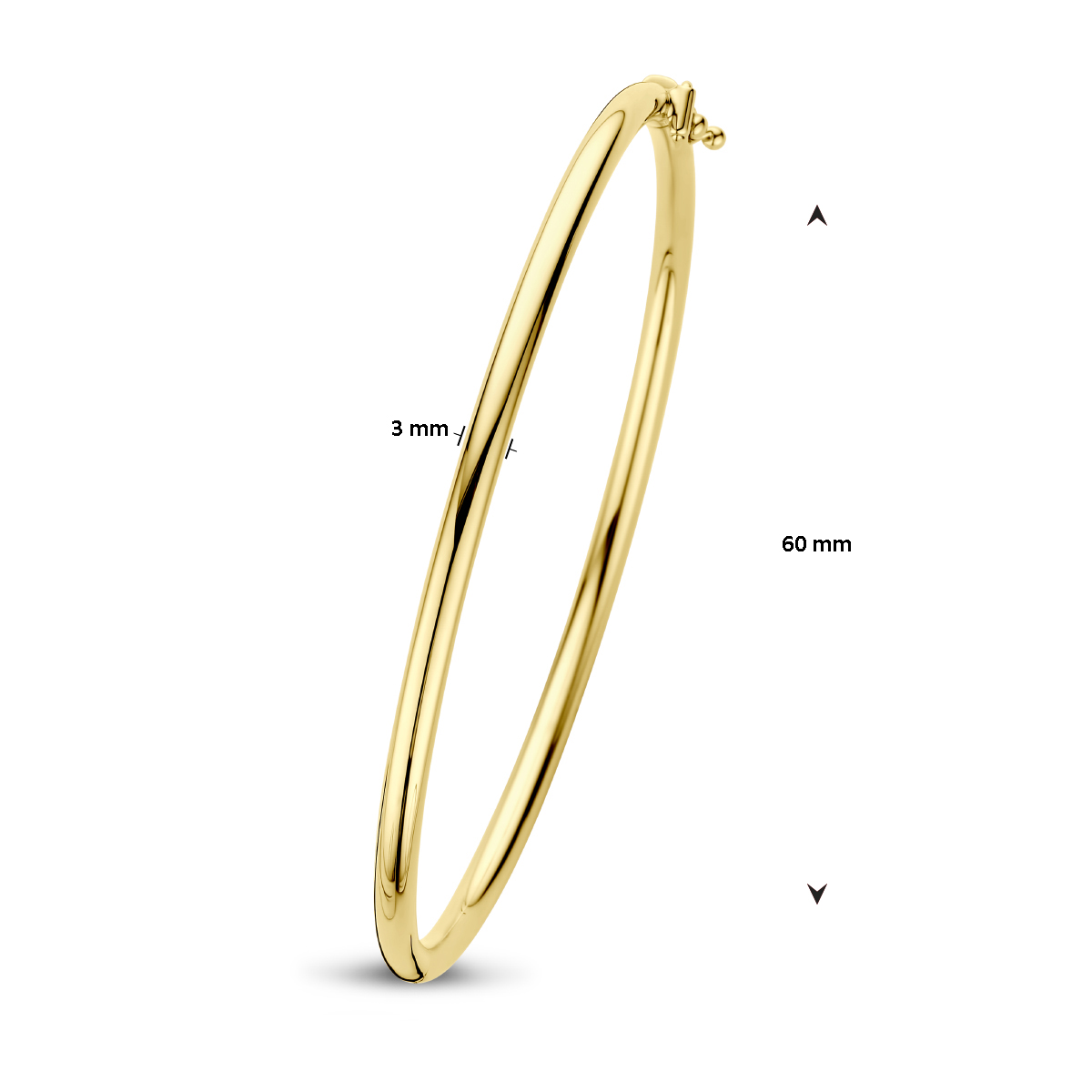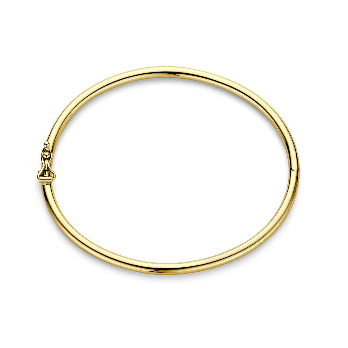 Geelgouden bangle met een afmeting van 3mm. De bangle is uitgevoerd met een ronde buis en een stevige scharnier sluiting.