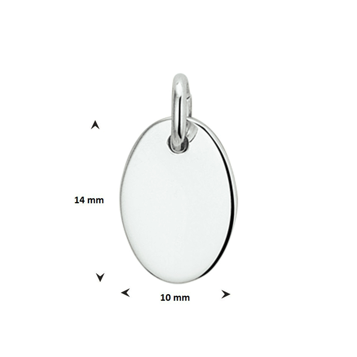Gerhodineerd zilveren ovale graveerhanger met een afmeting van 14x10mm uitgevoerd met een stevig hangoog. De hanger heeft een dikte van 0.9mm.