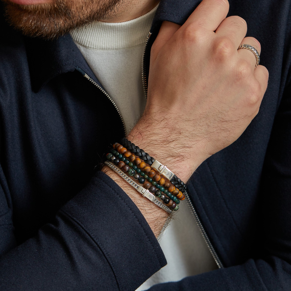 Armband van het merk Rebel & Rose. De armband heeft een hoogwaardige elastische stretch koord, met 6mm van Tiger Eye Blue, Tiger Eye Yellow, Brecciated Jasper, Rhyolite, Hematite Grey.