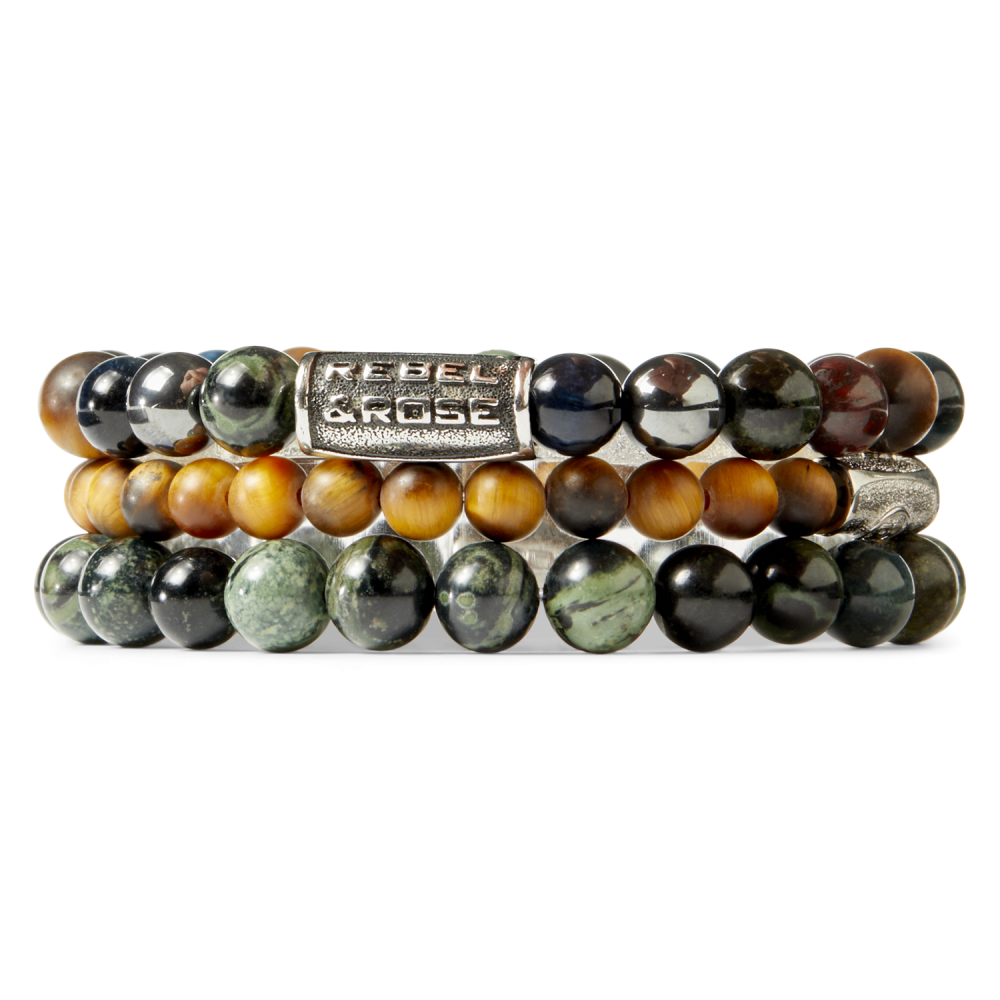 Armband van het merk Rebel & Rose. De armband heeft een hoogwaardige elastische stretch koord, met 8mm van Tiger Eye Blue, Tiger Eye Yellow, Brecciated Jasper, Rhyolite, Hematite Grey.